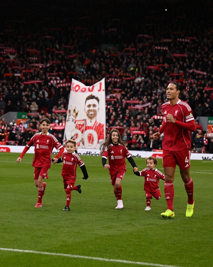 在赛事 开场前,利物浦领队 范戴克带领若塔的孩子们在安菲尔德运动活动 场 射门。