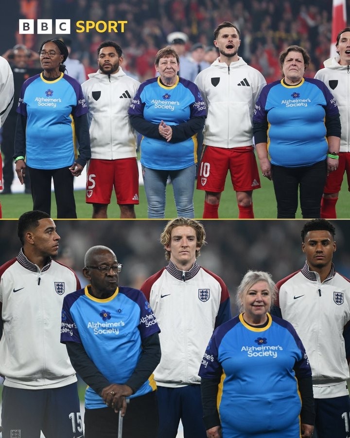 那场赛事 有一个非常美好的时刻,为了提高人们对阿尔茨海默症和痴呆症的认识,他们安排了患有这些疾病的老一辈球迷作为球童入场,球员们牵着他们走出来。然而,在奏国歌的时候,我确实注意到他们留下了其中两位,其中一位还坐在轮椅上。威尔士队奏国歌时,他们都和球童们挤在一起。但令人难过的是英格兰这边……球员们都挤作一团,而那位坐在轮椅上的先生被留在了那里,没有人试图去帮助。
