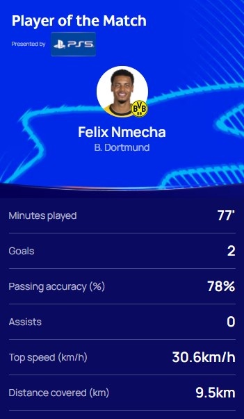 2射正2得分 ,欧冠官方:恩梅查当选多特4-2哥本哈根一役全场最佳