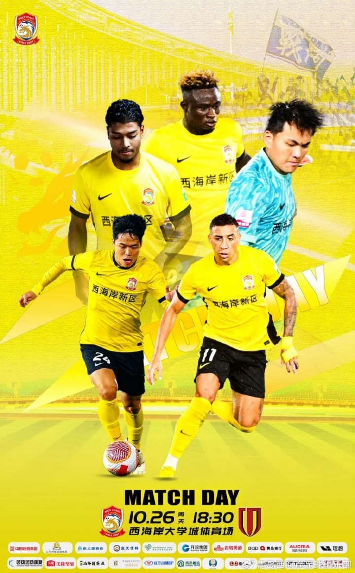 青岛西海岸后备 :26-王晗懿、37-东航、77-戚秉宇、13-宋浩宇、8-张修维、14-冯刚、68-方海洋、30-刘小龙、39-刘柏杨、56-高迪、99-鄢奇航