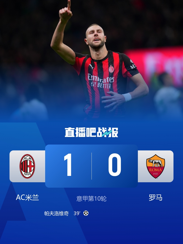 本轮意甲焦点战,米兰1-0击败罗马,莱奥助功 帕夫洛维奇打入全场唯一得分 。